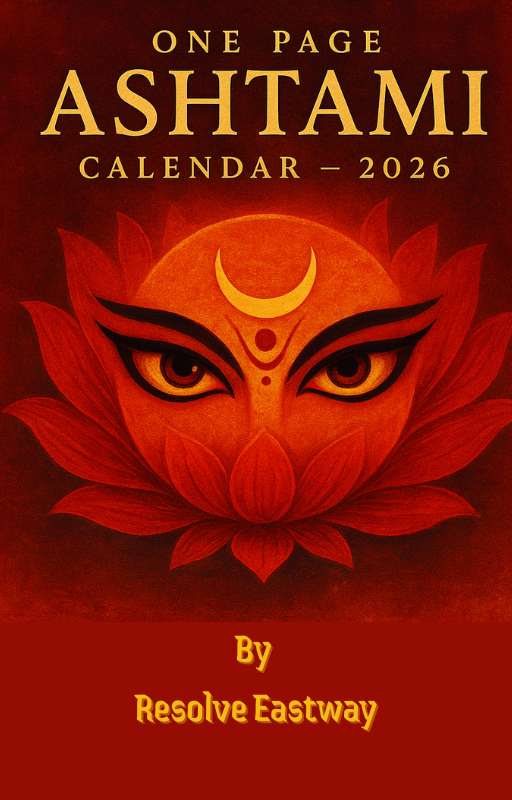 One Page Ashtami Calendar – 2026 by Resolve Eastway is a concise spiritual guide that presents all Ashtami tithis of 2026 in a clear, single-page format. It covers both Shukla Paksha and Krishna Paksha Ashtami dates with precise timings for every month, helping devotees easily plan fasts, rituals, and Shakti-based spiritual practices throughout the year. The calendar is meant for spiritual and educational use.