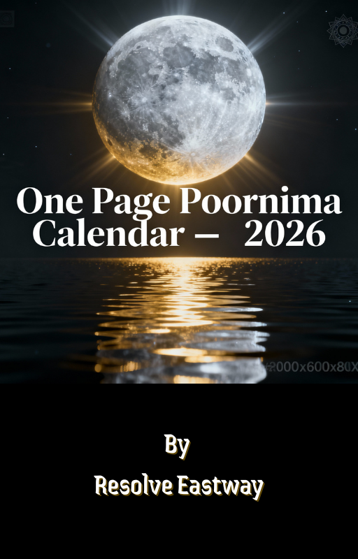 One Page Poornima Calendar – 2026 by Resolve Eastway is a concise spiritual guide that lists all Poornima (Full Moon) dates for every month of 2026 along with accurate timings and weekdays. Presented in a clean, single-page format, it helps devotees easily plan full-moon rituals, fasting, meditation, and sacred observances throughout the year. The calendar is intended for spiritual and educational use.